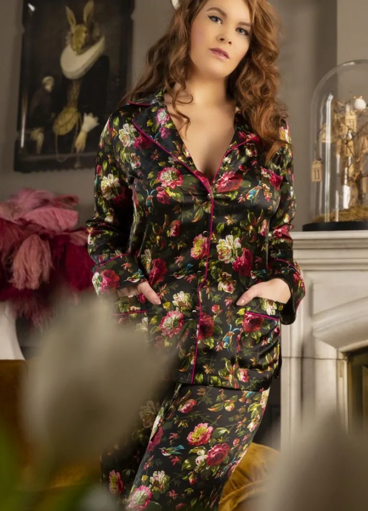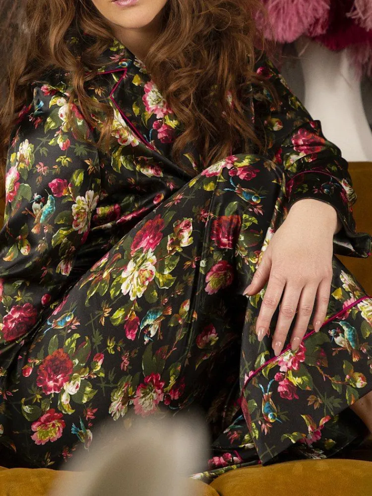 Seidenpyjama^Marjolaine LAST PIECE Seidenpyjama NURHAN schwarz-grün von Größe DE38 schwarz grün pink mit Zierbiesen