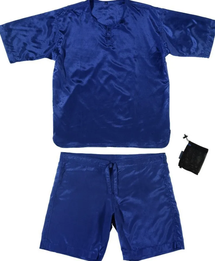 Den kurzen Reisepyjama für Herren gibt es in der Farbe tuareg (dunkles Blau) und in Größe M bis XXL. Dieser Reiseschlafanzug im klassischen Schnitt hat kurze Ärmel und kurze Beine. Das Oberteil hat eine kurze Knopfleiste mit zwei Knöpfen am Ausschnitt und die Hose hat einen anpassbaren Bund mit Zugbändern . Mit dem Packmaß von 14x13x5 cm und einem Gesamtgewicht von nur 112 bis 137 g (je nach Größe) fällt dieser handliche Reiseschlafanzug aus Seiden-Mischgewebe im Gepäck kaum auf. Der Pyjama wird gefaltet in einem kleinen Netzbeutel mit Zugband geliefert.