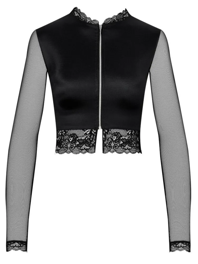 Das Minitop Diamant von Cadolle ist raffiniert und verführerisch. Das kurze Top besteht aus Satin und feinem, schwarzem Tüll und ist am Kragen und den Ärmelenden mit weicher Wäschespitze besetzt. Das Top mit einer Gesamtlänge von ca. 45 cm hat vorne einen mit Tüll hinterlegten Cut-Out. Es hat lange Ärmel und wird hinten mit einem goldenen Reißverschluss geschlossen.