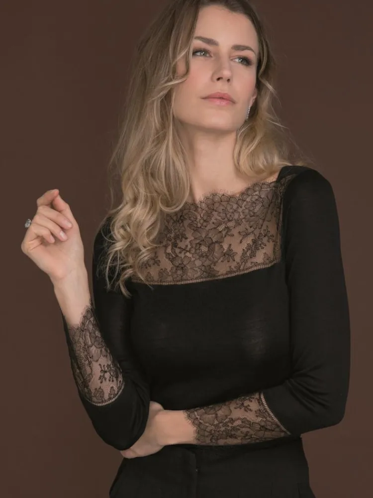 Merinowolle-Seide Langarm Shirt Barchetta schwarz von Artimaglia