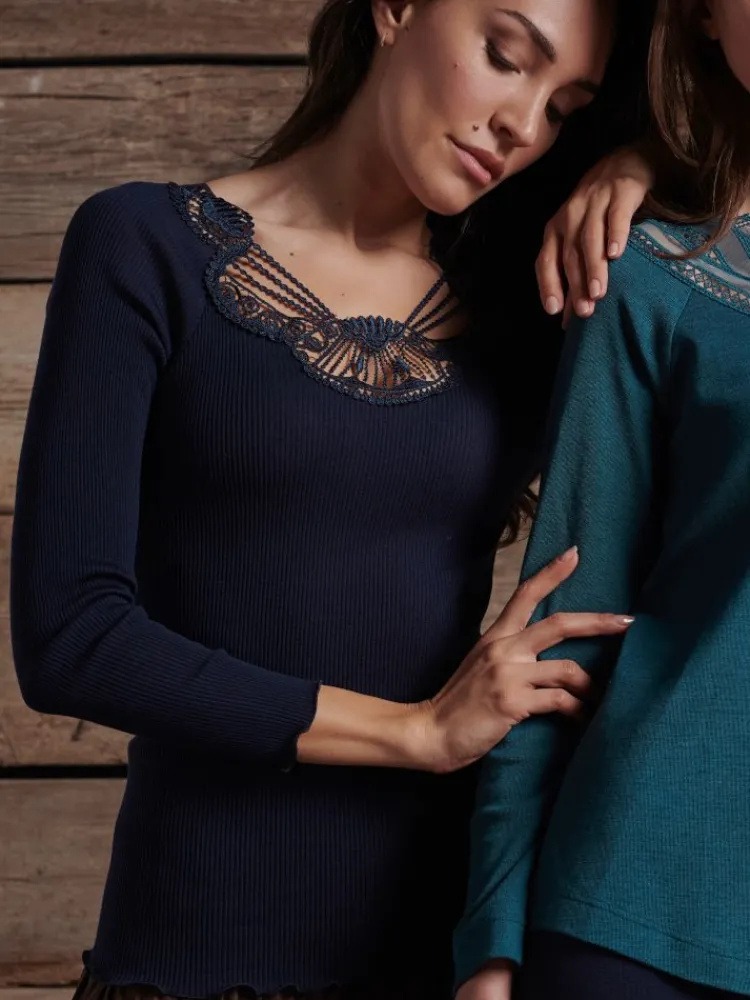 Das Langarm Top Wolle-Seide besteht aus einem besonders hochwertigen, rundgestrickten Jersey aus 70% extrafeiner, tasmanischer Merinowolle und 30% Seide in Kombination mit hochwertiger Makramee Spitze. Das Shirt besteht aus rundgestricktem Rippjersey und ist seitlich nahtlos. Dieses edle Shirt hat einen Rundhals-Ausschnitt und die Gesamtlänge ist ca. 62 cm.