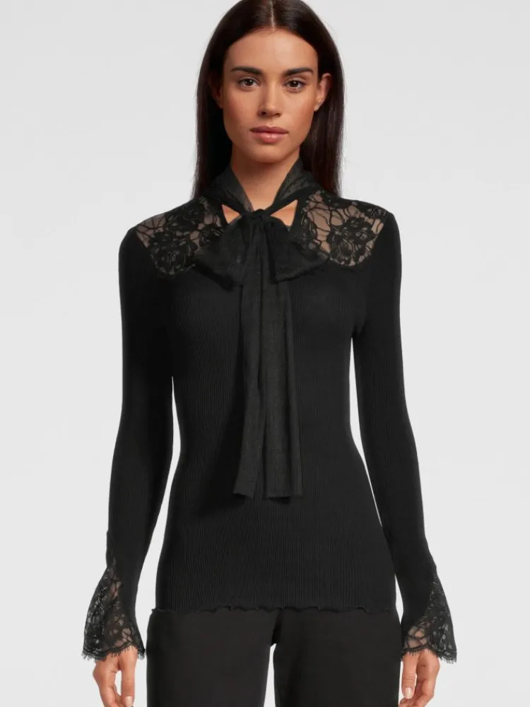 Merinowolle-Seide Langarm-Shirt mit Schleife schwarz von Oscalito