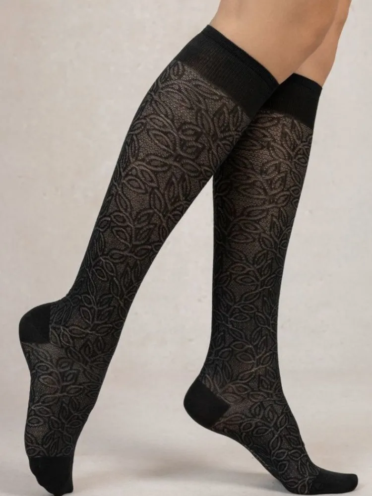 Diese langen Kniestrümpfe sind glatt und mit eingestricktem, feinem Blättermuster und in den Größe 36/38 oder 39/41 in der Farbe schwarz erhältlich.