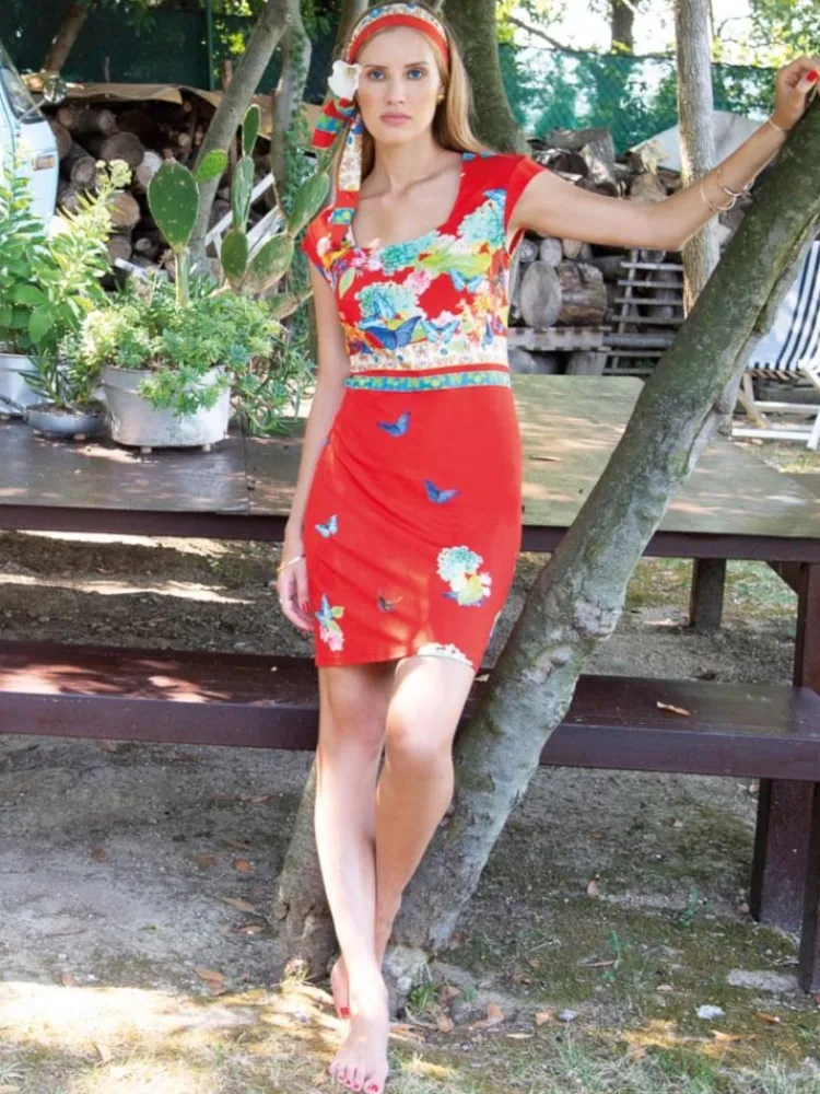 Dieses sommerliche Strandkleid hat einen ausgefallenen, bunten Druck mit Schmetterlingen auf leuchtend rotem Grund. Dieses modische Strandkleid ist perfekt für den Sommer geeignet. Es ist ungefüttert und kann daher als Sommerkleid, Strandkleid oder auch als Nachtwäsche und gemütliche Loungewear getragen werden. Außerdem passt es perfekt zur Bademode von Chiara Fiorini.