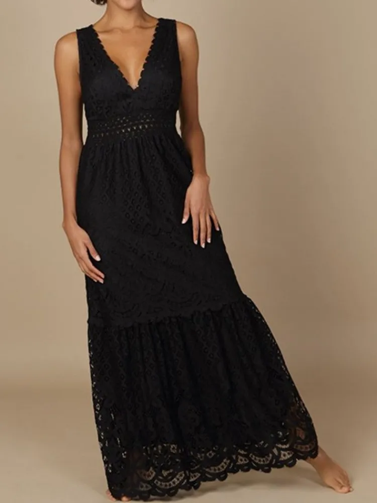 Das lange Kleid besteht komplett aus floraler Lochstickerei Spitze und ist mit einem eingenähten Unterkleid blickdicht abgefüttert. Unterhalb der Brust hat es einen elastischen Einsatz. Das lange Sommerkleid hat breitere Träger, einen V-Ausschnitt und ist ca. 145 cm lang.