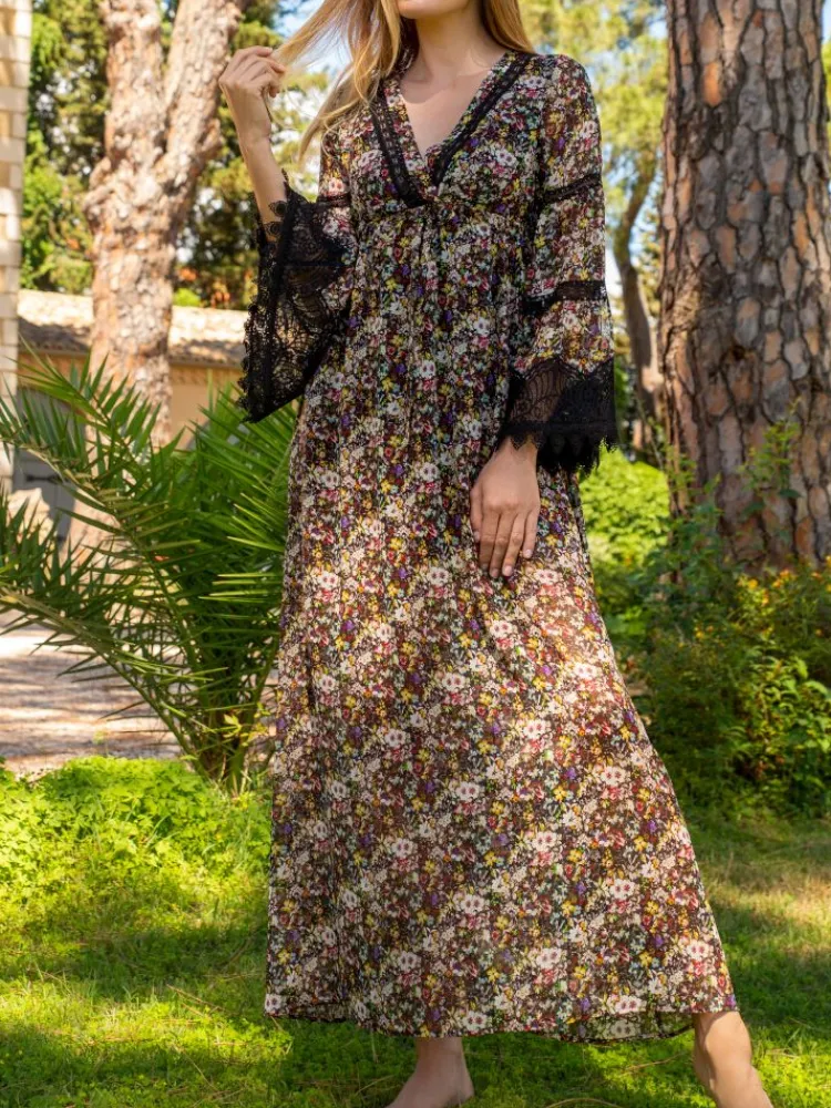 Strandkleider & Sommerkleider|Lounge-Wear^Marjolaine Seide Kleid OPHELIE lang Mousseline von schwarz bunt