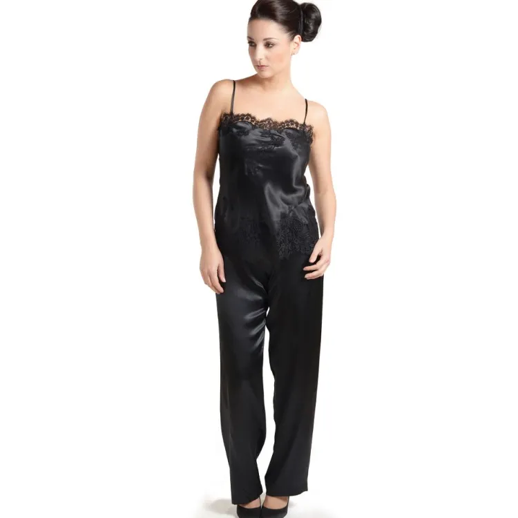 Die französische Spitze wurde in besonders aufwendiger Handarbeit als inkrustierte Spitze in den Satin aus reiner Seide eingearbeitet. Am unteren Saum ist die Spitze umlaufend gearbeitet. Die Büste ist mit der edlen Spitze benäht und blickdicht. Dieses mit ca. 75 cm etwas länger geschnittene Seidentop ist in Kombination mit der separat erhältlichen Pyjamahose als Nachtwäsche kombinierbar oder kann auch einzeln als raffinierte Oberbekleidung getragen werden.