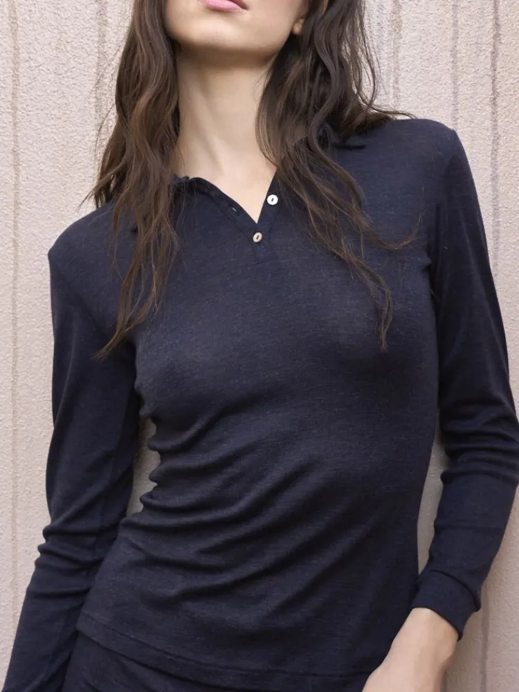 Dieses hochwertige Wolle-Seide Langarmshirt Briseide von Boglietti ist aus einem hochwertigen Jersey aus 70% Wolle und 30% Seide gefertigt. Das Shirt hat eine Länge von ca. 64 cm, einen Polokragen und lange Ärmel. Der V-Ausschnitt ist öffenbar und mit drei Knöpfen versehen.