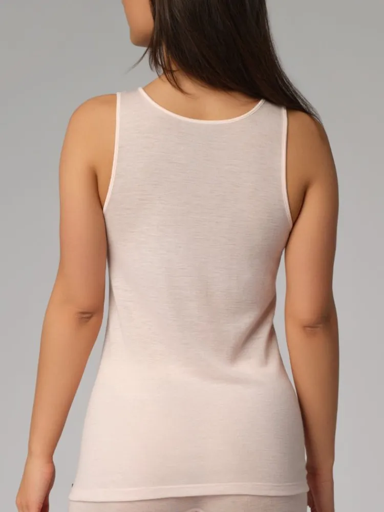 Das feine Camisole Unterhemd Wolle-Seide besteht aus einem besonders hochwertigen, rundgestrickten Jersey aus 70% feiner kbT Merinowolle und 30% Seide mit einem Flächengewicht von ca. 140g/m². Die Herstellung des Stoffs erfolgt in Süddeutschland und die Konfektion in Europa. Dieses edle Unterhemd mit breiten, nicht verstellbaren Trägern ist ca. 64 cm lang. Das Unterhemd hat einen Rundhals Ausschnitt. Das Material ist eine rundgestrickte „Schlauchware“ und daher ist dieses Top seitlich nahtlos.